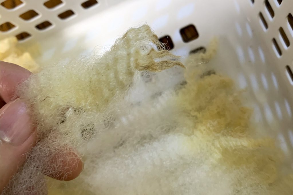 以前購入した国産羊毛。毛の房(ステイプル)の先端が固まってカリカリしています。